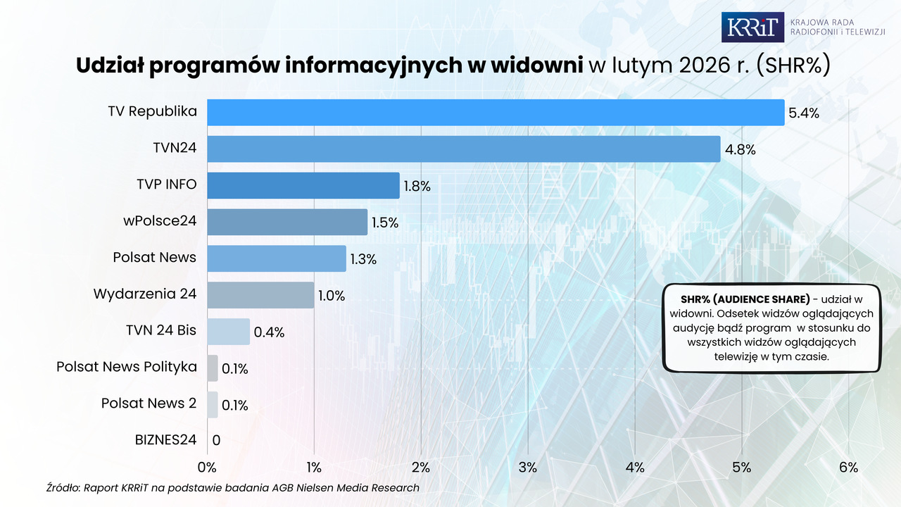 Liderem wśród informacyjnych programów telewizyjnych pozostała Telewizja Republika, z nieznacznym spadkiem oglądalności w porównaniu do stycznia 2026 (mniej o 13 192 widzów). Wyprzedziła ona TVN24 oraz TVP Info. Na kolejnych miejscach w rankingu uplasowały się: wPolsce24, Polsat News oraz Wydarzenia24. Warto podkreślić, że w tej kategorii najwyższy wzrost udziałów w widowni rok do roku, odnotowała telewizja wPolsce24.
