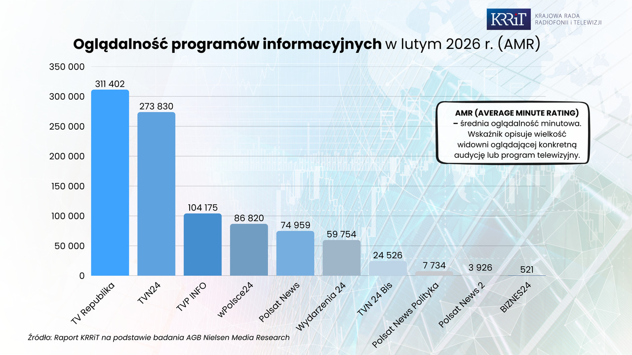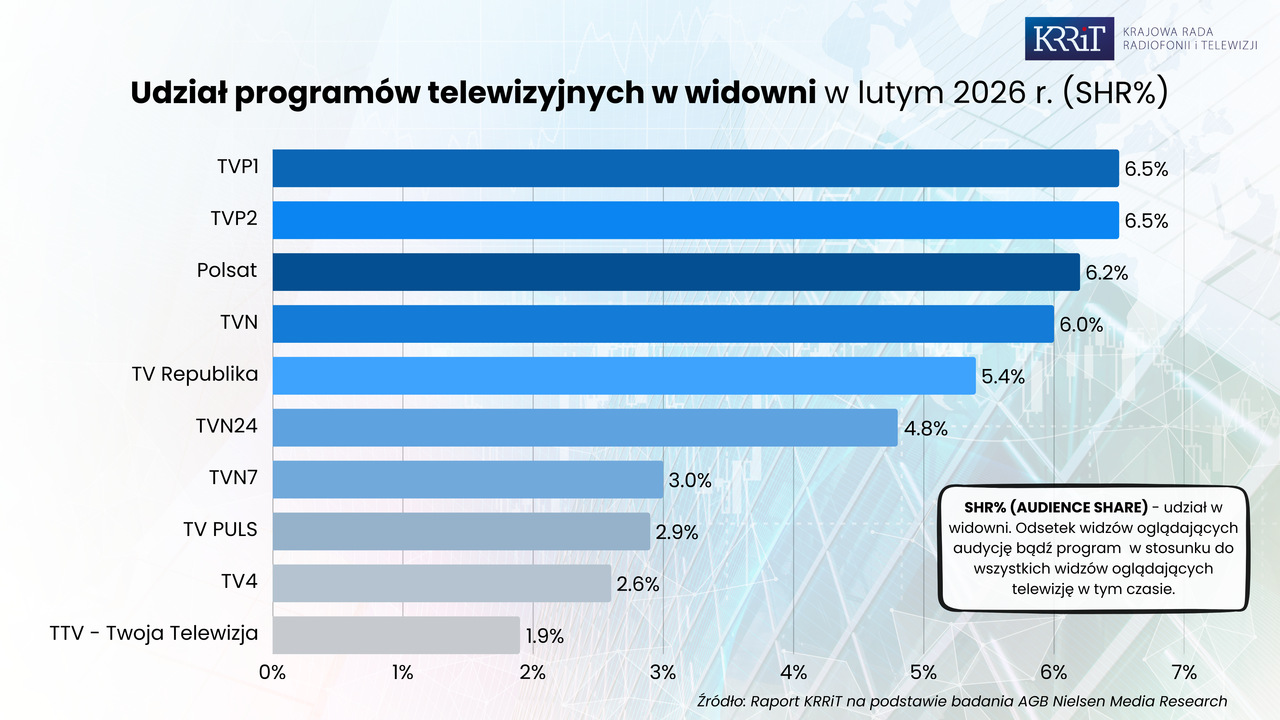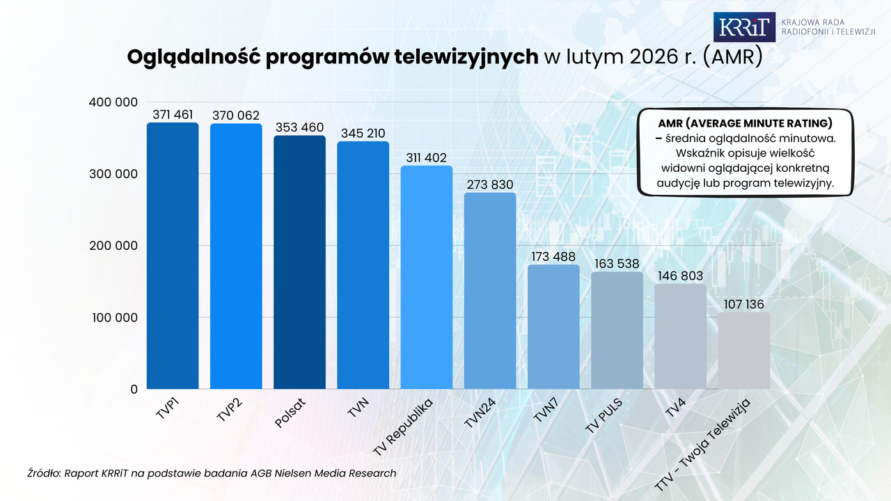 Oglądalność programów i audycji telewizyjnych w lutym 2026 - raport KRRiT